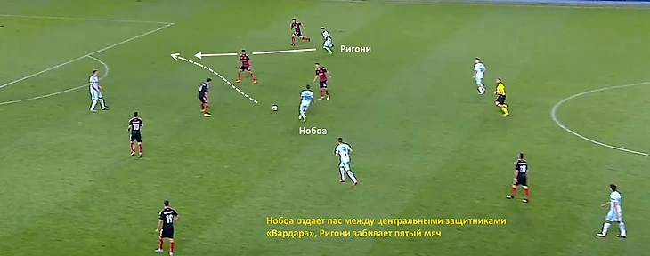 Нобоа при игре один в один без мяча проявил себя хуже (5 проигранных единоборств из 11), но в части разрезающих передач Кристиану в Скопье равных не было. Эквадорец сделал 5 пасов под удар (Дзюба и Жирков – по 2), 2 из которых оказались результативными, также полузащитник поучаствовал и в голе Ивановича, отдав пяс пяткой на Полоза. Блестящие передачи Нобоа из глубины постоянно создавали проблемы обороне «Вардара».