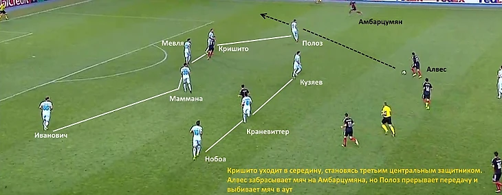 Другая особенность относительно новой схемы Манчини (она применялась только в первом тайме игры с «Тосно» и в гостевом матче с «Утрехтом») заключалась в функциях Полоза при позиционных атаках «Вардара». Без мяча он опускался на место левого защитника, а Кришито становился третьим центральным.