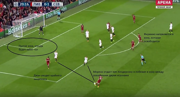 Первый гол с этого и начался: Матип блестяще отрезал нескольких игроков гостей передачей на Салаха, тот в касание откатил Вейналдуму, который прошел по правому флангу и передал мяч Фирмино в зону 14 (небольшой прямоугольник перед штрафной прямо по центру). После единоборства с защитником «Севильи» мяч отскочил назад к Хендерсону, тот отдал на Морено.