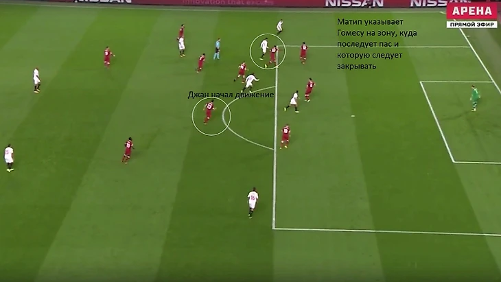 Пока игроки «Севильи» разыгрывают эту комбинацию, Джан начинает движение в свою штрафную на случай прострела или навеса, однако останавливается в момент передачи, увидев движение Ловрена. В этом заключается ошибка номер два: игрок идет именно что страховать зону, и, не остановись Эмре, он бы вынес мяч – страховать нужно в любом случае, для этого футболист и двигался к своим воротам. Деяна Ловрена за его промах осуждать будет глупо: хорват оступился и не смог попасть по мячу – обидно, по-детски, но это явно не позиционная ошибка, и Клопп напихает на разборе матча не ему, а Джану и Гомесу.
