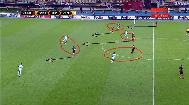 Соперник же постоянно пытался поджимать первой линией прессинга, стараясь лишить наших центральных защитников + опускающегося к ним опорника возможности продвигать мяч, но, ввиду плохо организованного прессинга, сделать этого не удавалось. Вардар часто увлекался персональной опекой, оставляя тем самым Зениту огромные свободные зоны.