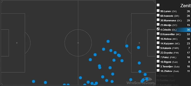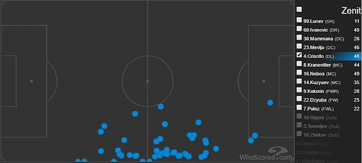 Стоит отметить, что в то самое пространство между полузащитой и защитой соперника Зенит постоянно либо опускался Дзюба, либо забегал кто-то из тройки ЦП. Это характеризует факт того, что Манчини нащупал слабое место, через которое можно спокойно выходить в атаку. Работало регулярно.