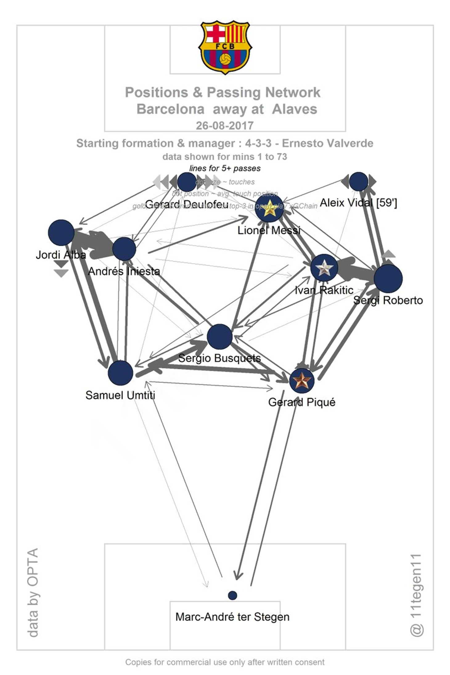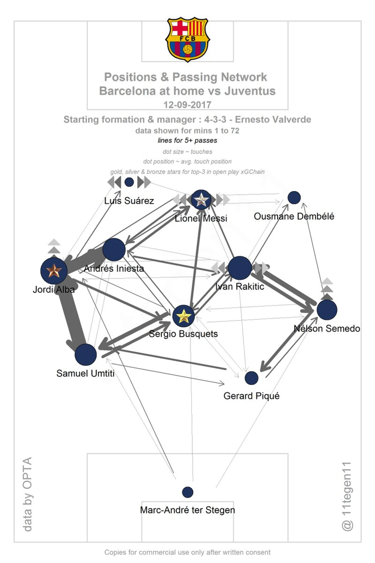 2. То, что показывает «Барса», постоянно и мощно. Это не один суперматч с хаотичной палитрой передач и зависимостью от звезды. На картах передач есть постоянные сочетания и четкая структура. Учитывая, что главные стрелочки к Месси идут от Иньесты и Бускетса, все работает как надо: