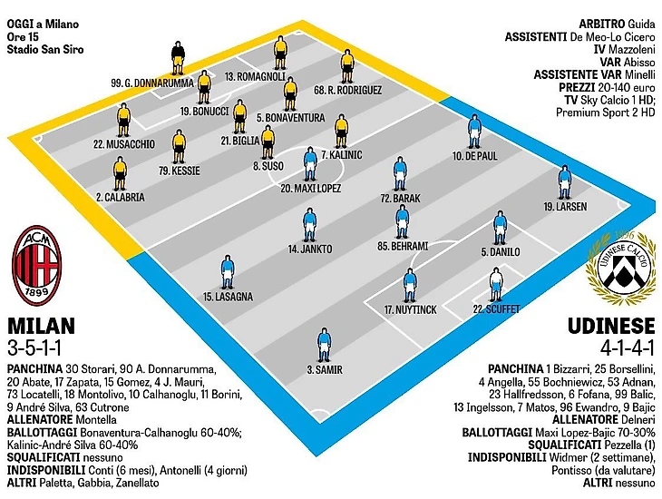 Стоит отметить, что в матче с «Удине» вторую игру к ряду «дьяволы» сыграют в три центральных защитника. На этот раз, место Кристиана Сапата, место в тройке стартовых центральных защитников наряду с Бонуччи и Романьоли, займет Матео Мусаккьо.