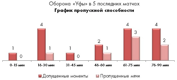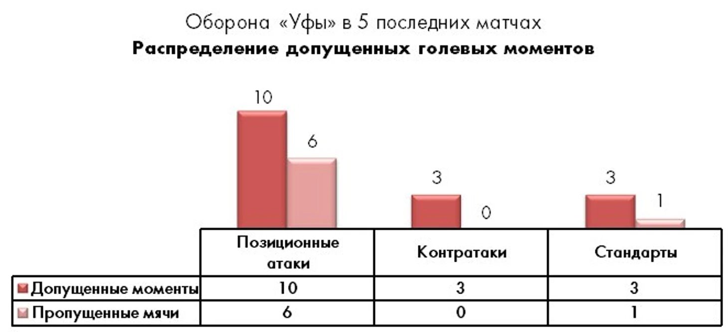 Несмотря на пятиматчевую безвыигрышную серию, стройность обороны «Уфы» в этих поединках преимущественно сохранялась (16 допущенных голевых моментов у своих ворот, лишь 4 которых можно отнести к категории «явных»). Даже болезненное поражение от «Ростова» (1-4) можно назвать несколько нелогичным и отчасти случайным (ростовчане забили едва ли не больше, чем создали).