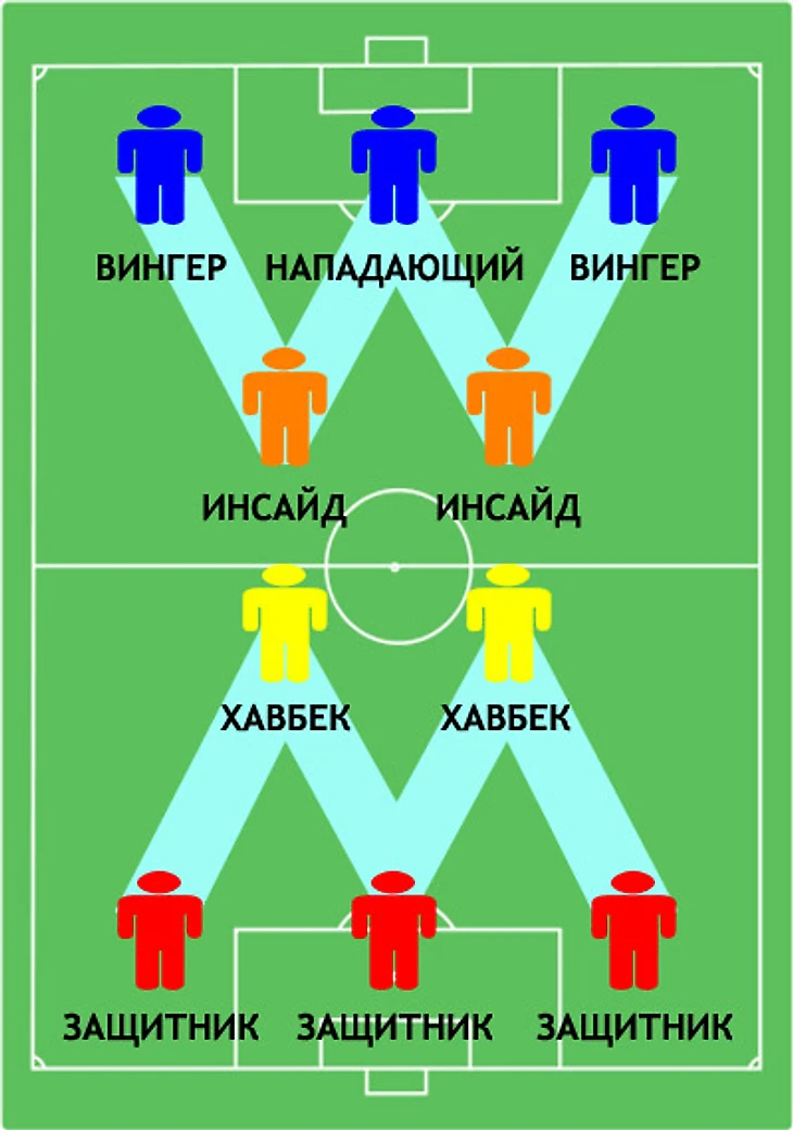 Полузащитников при этом стало двое, но Чепмен оттянул немного назад двух нападающих. При этом в центре поля появился как бы квадрат из четырех игроков, легко переигрывающий полузащиту соперника, действующего по прежней схеме 2–3–5. Игроки же самого «Арсенала» были теперь расставлены по схеме 3–2–2–3. Это была знаменитая система «W-M» или «дубль‑ве», которую затем взяли на вооружение футбольные клубы всего мира.