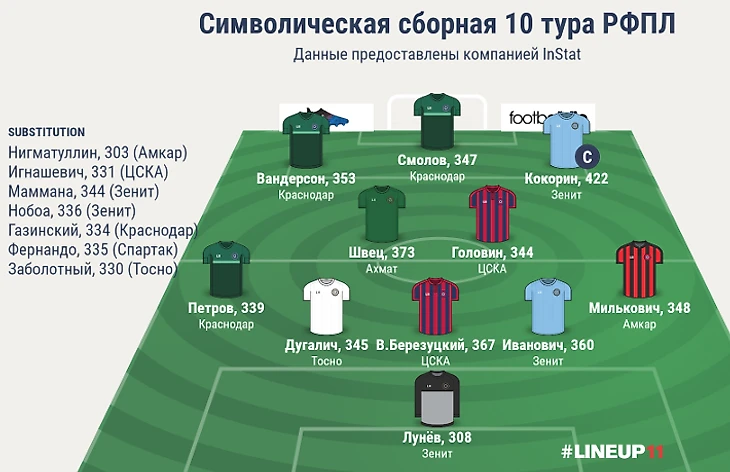 Лучшим клубом 10 тура РФПЛ стал "Зенит" со средним общекомандным рейтингом InStat Index, равным 316 баллам. Худшая команда - "Анжи", набравшая лишь 241 балл.