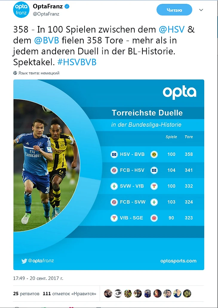 358 – в 100 матчах между «Гамбургом» и «Боруссией» Дортмунд было забито 358 голов, больше, чем в других дуэлях в истории БЛ. Зрелище. На картинке: самые богатые на голы дуэли в истории Бундеслиги. Игры / Голы.