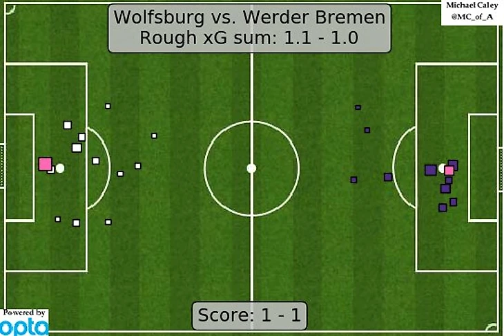 В отсутствие главных забивал Гомеса и Клозе, команды, однако, не стали жаться к воротам - турнирная ситуация не позволяет. В первом тайме доминировали хозяева, и Ориги в первый раз отличился за новую команду. Но во втором повторилась всем давно знакомая история - игра у «Вольфсбурга» разладилась, ушла острота, а «Вердер» насел на ворота волков, заслуженно сравнял счет (Бартельс точно пробил головой после подачи активного Дилэйни) и мог добиться большего, но Гебре Селассие простил хозяев.