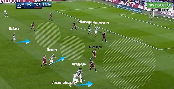 Во многом француз пользовался любовью Куадрадо к смещениям в центр и пристрастием Дибалы к игре из глубины. Центр полузащиты "Торино" по-прежнему напоминал проходной двор, и даже компенсация удаления в виде появления второго опорника не исправляла ситуацию. Обратите внимание: гости проваливаются также в зоне левого защитника. Ансальди часто был вынужден выдвигаться ближе к центру, страхуя партнеров, и в данном эпизоде Лихштайнер пытается воспользоваться ситуацией.