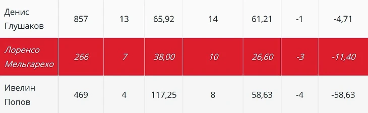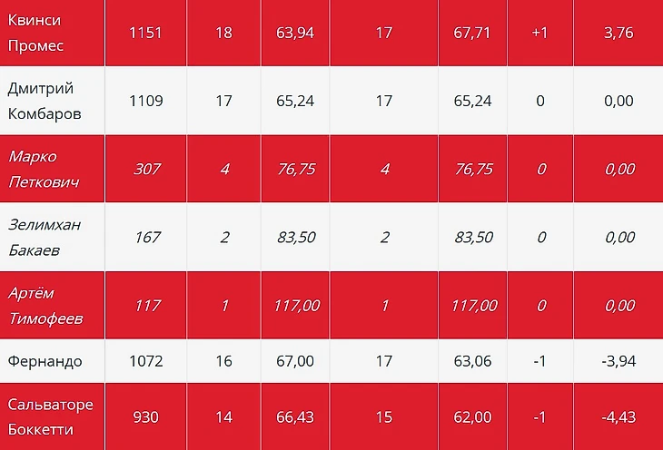 То, что у обоих наших лидеров-опорников, Дениса Глушакова и Фернандо, а также примкнувшего к ним Сальваторе Боккетти, плюс-минус отрицательный — тоже симптом, мягко говоря, неприятный. Минус, конечно, небольшой, всего -1, но когда в прошлом сезоне у первого этот показатель был +11, а у второго и третьего вообще +12 — это, скажем мягко, провал. И, учитывая, сколько они играют, не спишешь даже на статистический выброс, как у попавшего под «Локомотив» и получившего 1:4 за 45 минут Мельгарехо.