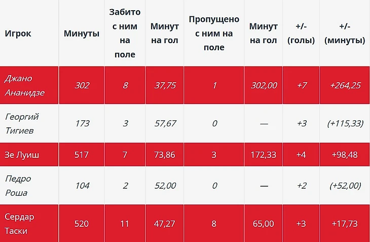 «Плюс-минус» Джано Ананидзе, конечно, выглядит еще более невероятным: в чемпионате России, например, с ним на поле «Спартак» в этом сезоне вообще еще не пропускал. Но всерьез называть лидером команды игрока, который не проводит за нее и четверти игрового времени, к сожалению, нельзя.