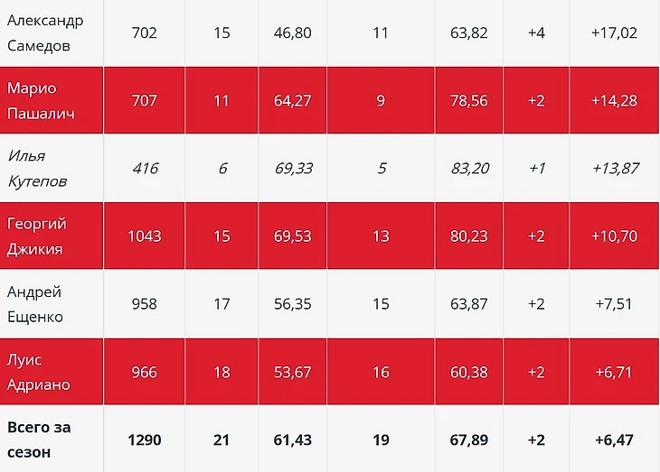Ну а закончить все-таки нужно на хорошей ноте. Как ни парадоксально, лучше всего у «Спартака» работает атака в присутствии ругаемого многими Александра Самедова (46 минут на один забитый гол), а также Сердара Таски (хотя, конечно, влияние защитников на атаку, как и нападающих на оборону, весьма косвенно); оборона, впрочем, при них не блистает, пропуская чуть чаще, чем в среднем за сезон. У Луиса Адриано и Андрея Ещенко плюс-минус тоже, так сказать, с креном в атаку, но не такой хороший.