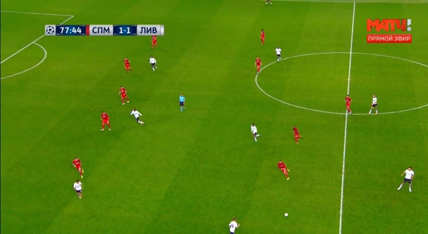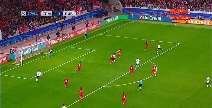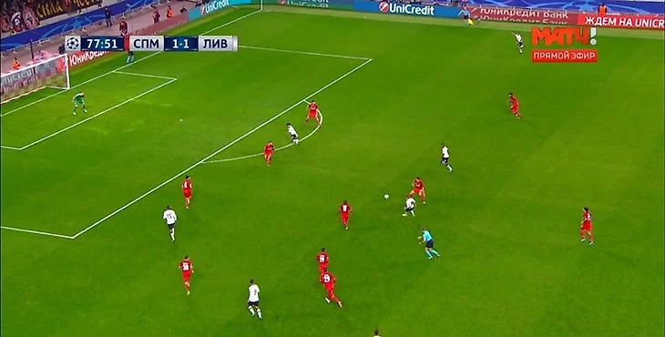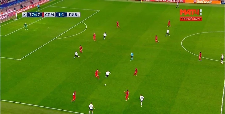 Ну и к чему была эта попытка поиграть в супергероя? Кутепов отыгран, Ещенко до линии мяча, и каждому защитнику из оставшейся тройки приходится смещаться правее, прикрывая ошибку Кутепова. Естественно, на правом краю атаки у «Ливерпуля» свободная зона размером с небольшое государство, и туда идёт мяч.