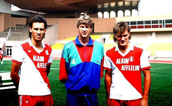 Арсен Венгер презентует новичков-англичан «Монако» Гленна Ходдла и Марка Хейтли перед чемпионским cезоном, 1987.