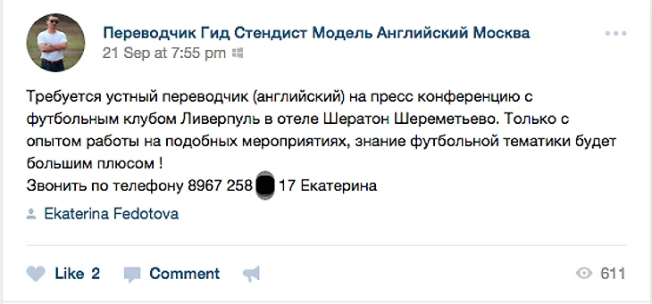 Наверняка все слышали про фейл переводчицы на прессухе «Спартак» – «Ливерпуль». Так вот, зайдя на ее страницу vk (ее id лежит в открытом доступе уже почти день), я обнаружил в топе подписок интересную группу «Переводчик Гид Стендист Модель Английский Москва» с 7000 подписчиков. В таких группах обычно сидят люди, у которых не хватило мозгов завести себе профиль на любой бирже фриланса и мониторить вакансии там. Короче, порог вхождения в этих группах довольно низок. Так вот, вбив в поиск по стене группы слово «ливерпуль», я нашел ОЧЕНЬ ЗАНЯТНОЕ ОБЪЯВЛЕНИЕ (на скриншоте). Автор этого объявления работает в тур-агентстве, в которое, судя по всему, обратился за помощью «Ливерпуль». Дальнейшее развитие событий представить довольно легко.