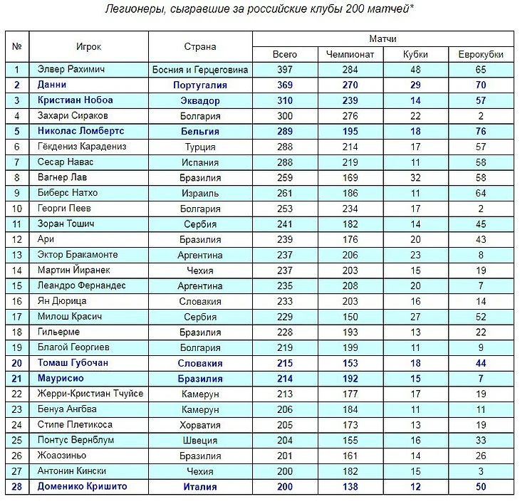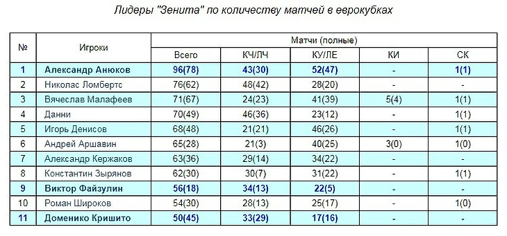 Примечание: без учёта матчей в низших лигах. Синим цветом выделены футболисты, выступавшие в "Зените"