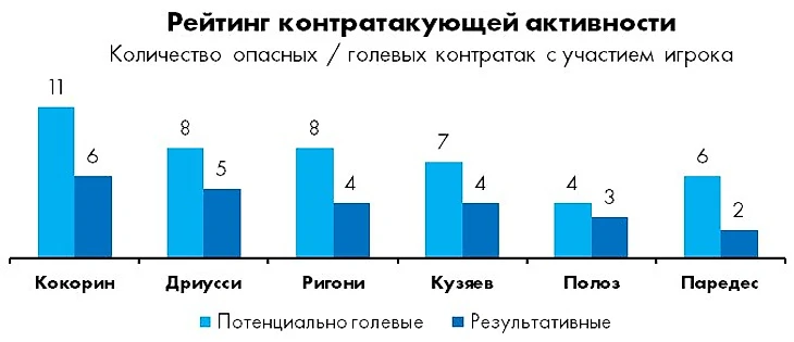 Он возглавляет и общекомандный рейтинг контратакующей активности, хотя скрытым лидером этого зачета является Эмилиано Ригони, успевший насобирать внушительную статистику всего лишь за 300 игровых минут (у Дриусси – чуть за 1000, у Кокорина – более 1400).