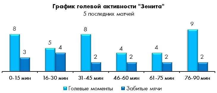 Отрадно, что проблема дефицита активности в первых таймах постепенно теряет актуальность. Стартовая активность «Зенита» в 5 последних матчах вылилась в 21 голевой момент – на 2 больше, чем в первых 13 матчах сезона.