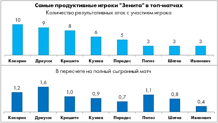 Помимо лидерства Кокорина, интерес вызывает отличная статистика Дриусси, набравшего 9 из 11 результативных баллов именно в ключевых поединках. Особый настрой на важные матчи наблюдается также у окрыленного повязкой Кришито (8 из 11) и старательного Кузяева (6 из 9), из раза в раз подтверждающего свою состоятельность на топ-уровне.