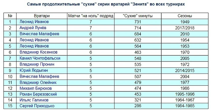 Самые продолжительные "сухие" серии вратарей "Зенита" в чемпионатах страны