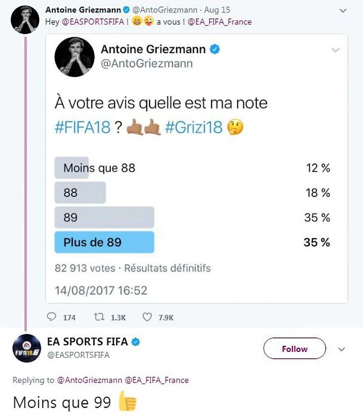 Французский полузащитник Атлетико одним негодованием не ограничился и подключил болельщиков, которым предложил проголосовать за его рейтинг.Большинство пользователей выбрали вариант «Более 89», и футболист обратился к создателям игр с просьбой учесть это мнение.