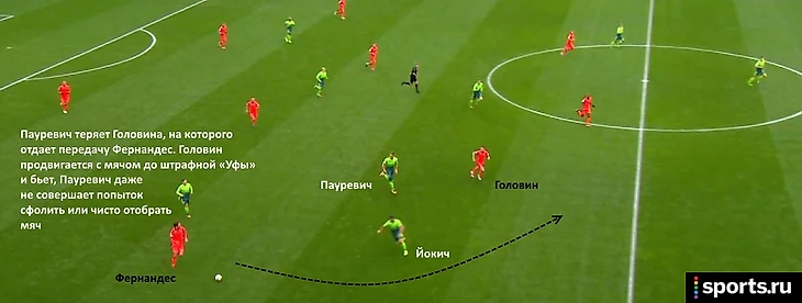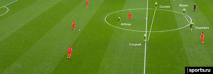 Важнейшая фигура для всего построения «Уфы» – Игбоун. Команда Семака имеет серьезные проблемы с первой фазой атаки, с открываниями опорных хавбеков, поэтому на чужую половину уфимцы переходят либо через латералей (чаще всего – через Йокича), либо через заброс на Слая.
