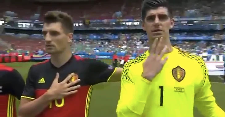 Тибо Куртуа трогает свой подбородок во время исполнения гимна сборной Бельгии.