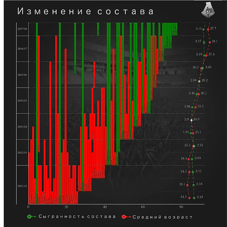 P.S: в инфографике были учтены все футболисты, попадавшие в заявку клуба. Столбцы обозначают период времени, когда футболист выступал за "Локомотив" (шкала времени - сбоку). Столбец выделен зеленым, если футболист до сих пор играет за "Локомотив".