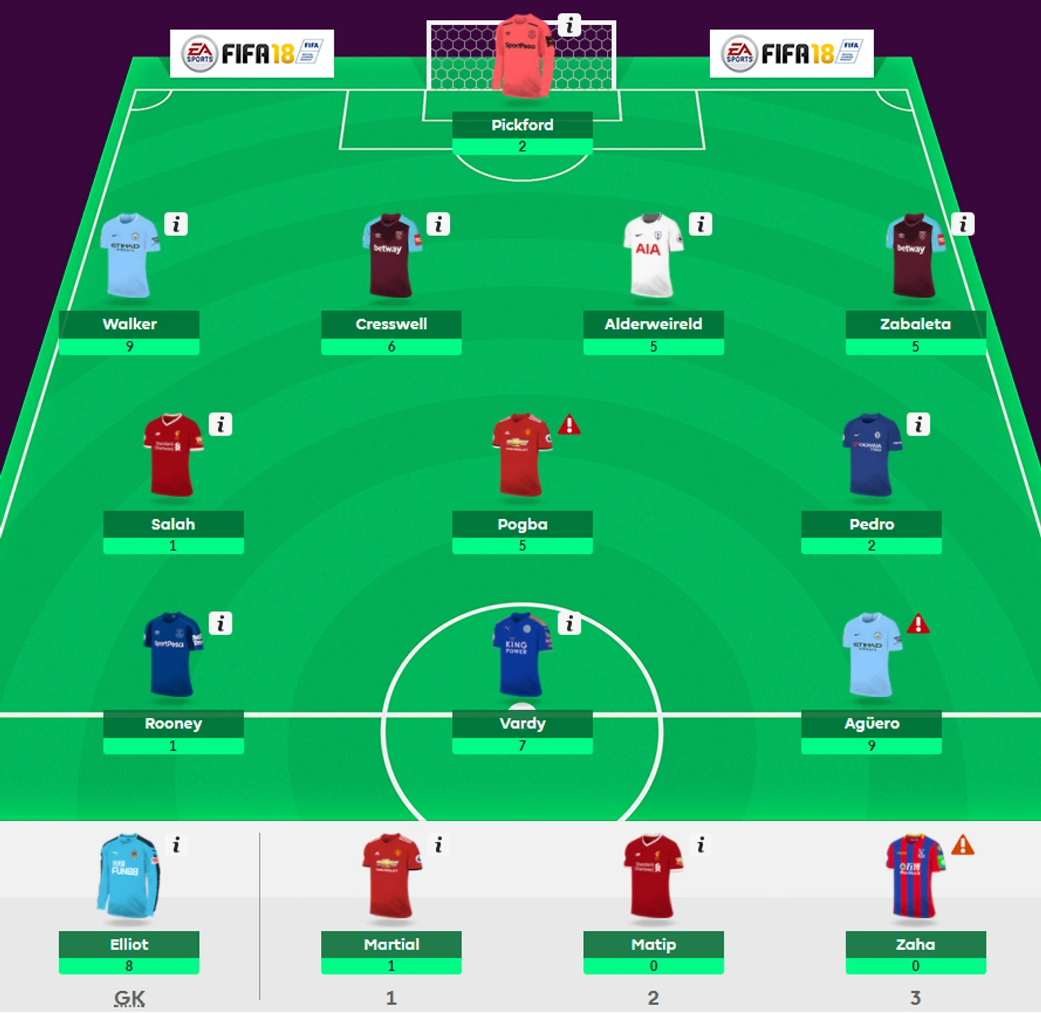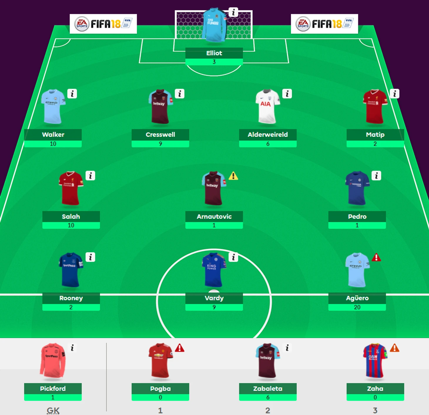 Здесь Агуэро, принесший аж 20 очков и еще 5 удачных попаданий (Уокер, Крессуэлл, Альдервейрельд, Салах и Варди). Сбалансированный состав.