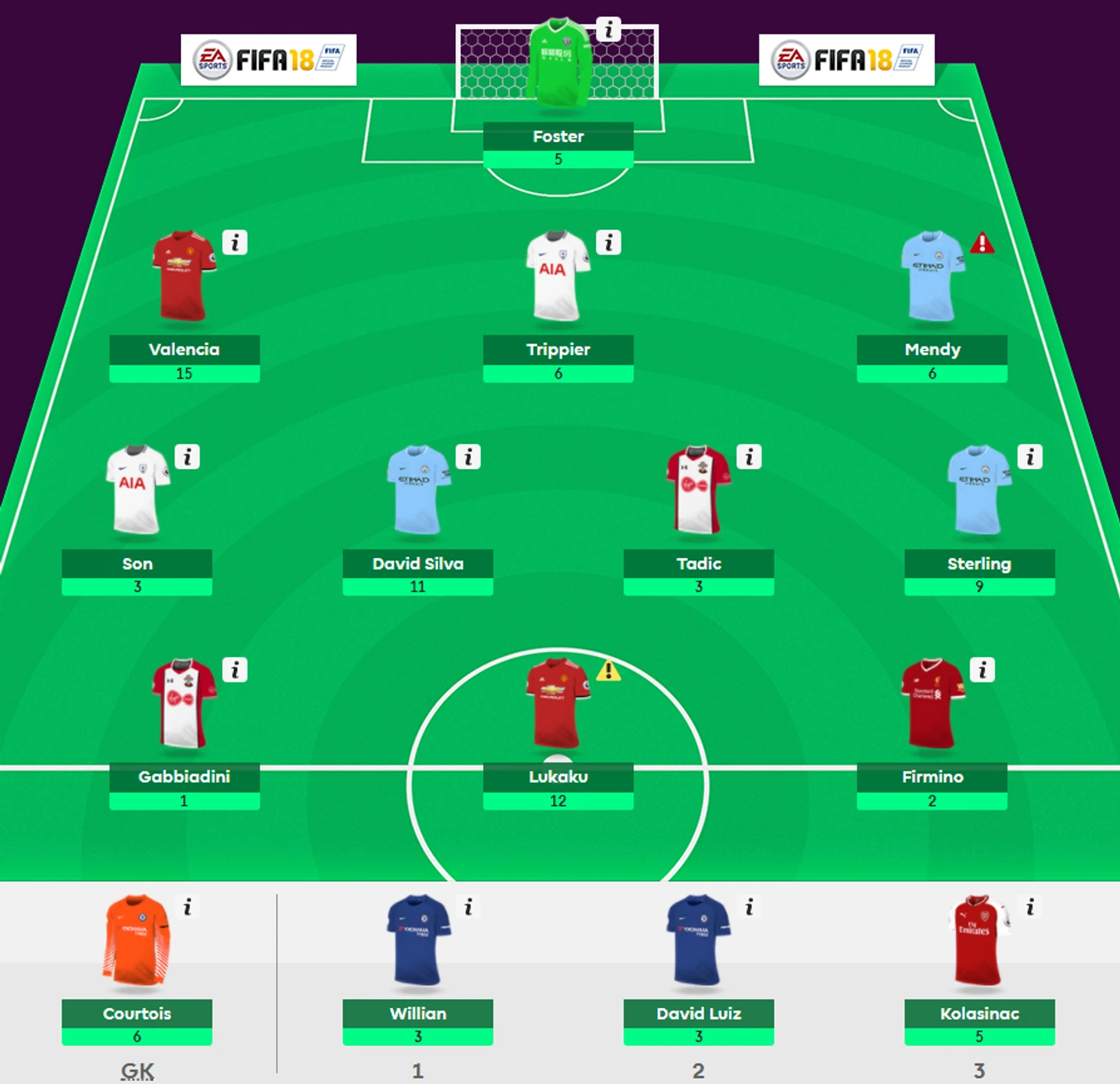 Почти все очки принесла удачная ставка на 2 манчестерские команды (Давид Силва, Стерлинг, Менди, Лукаку и Валенсия). Кроме этого результативными оказались пики Триппьера и Фостера.