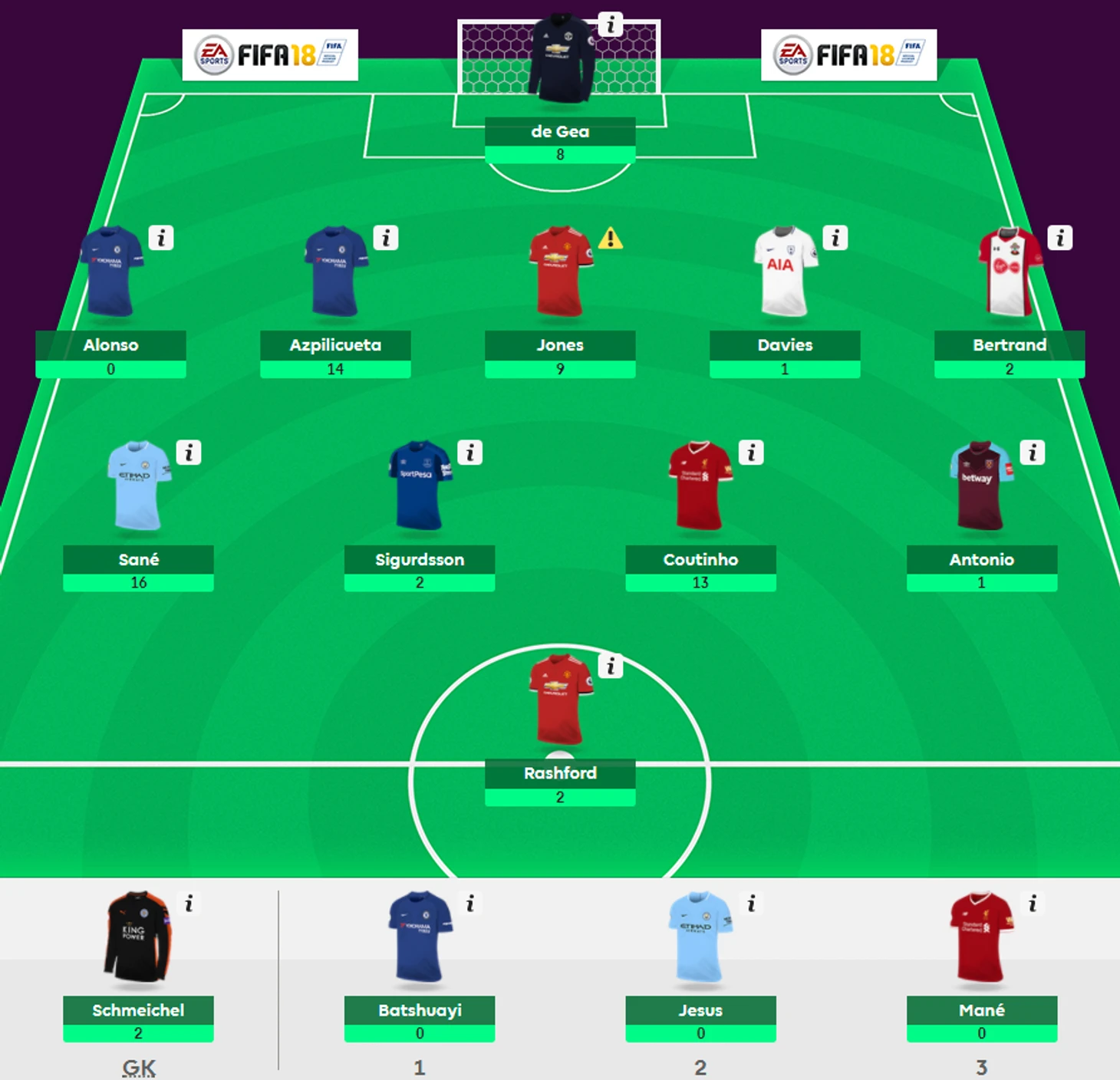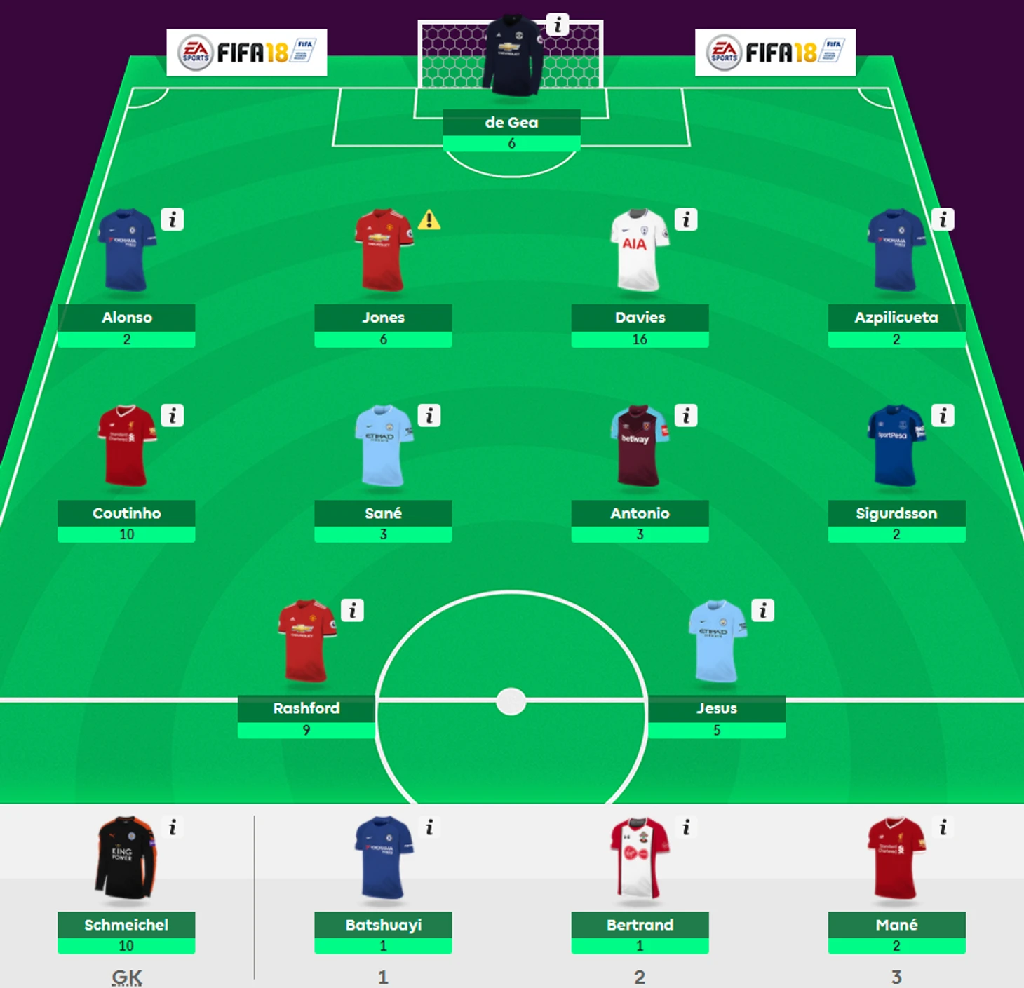 На этот раз Дэвис в старте и с 16 очками! Кроме него очки принесли 3 игрока МЮ (Де Хеа, Джонс и Рэшфорд), а также Коутиньо и Жезус.
