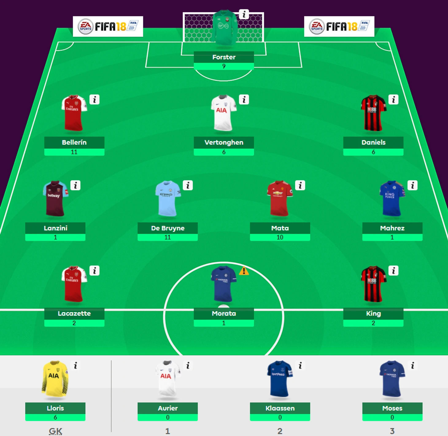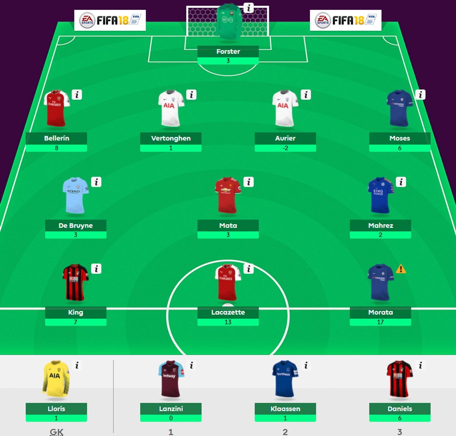 6 игроков из 11 набрали очки (Форстер, Беллерин, Вертонген, Дэниелс, Мата, Де Брюйне). Любопытно, что на этот раз успешное в 6 туре нападение (Мората, Ляказетт, Кинг) осталось без результативных действий.