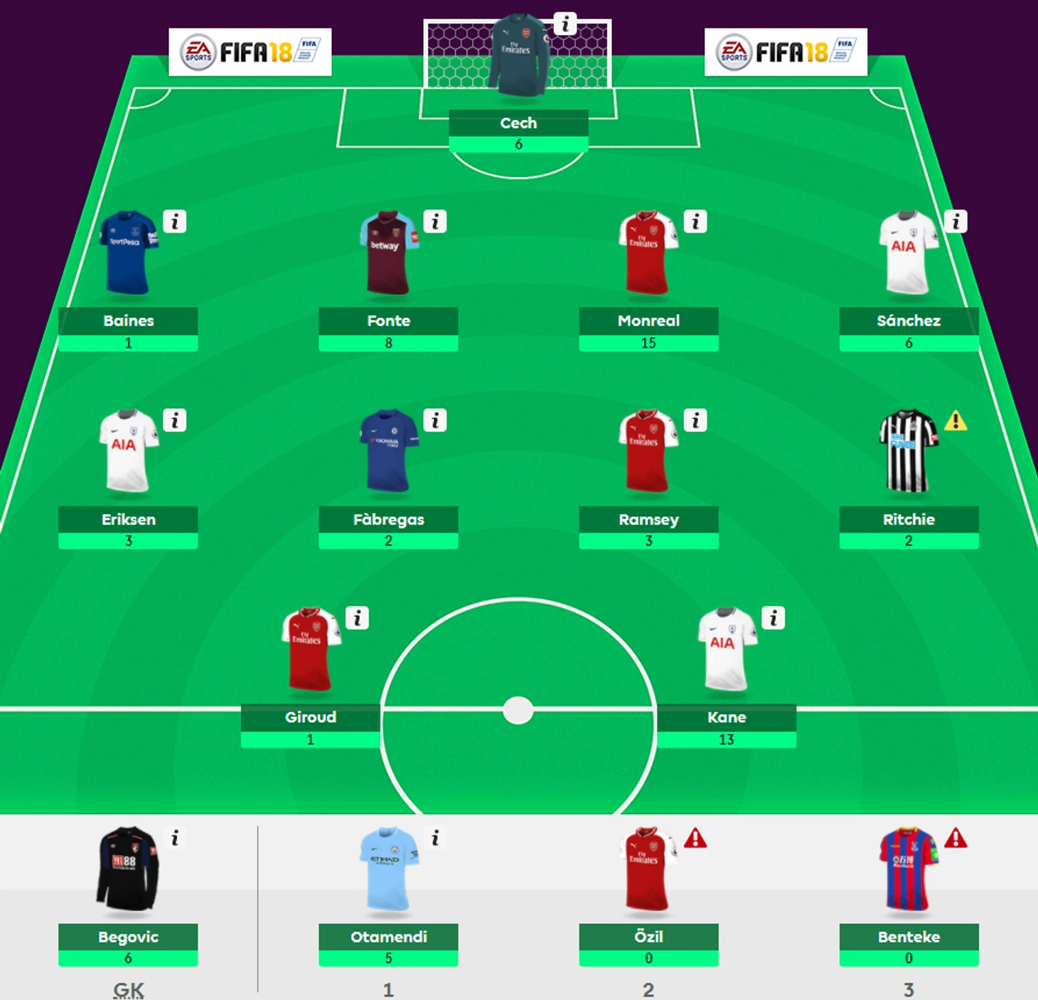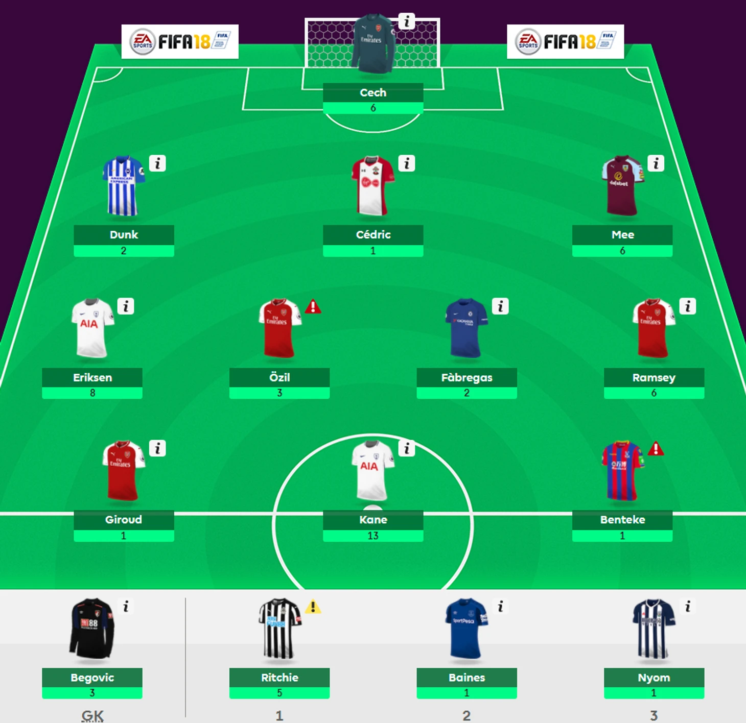 Основные очки команде принесли 2 игрока Тоттенхема Кейн и Эриксен - 21. Кроме этого в составе оказалось аж 4 игрока Арсенала! Но в сумме они смогли дать только 16 очков. На лавке, как и в предыдущей команде, остался игрок сорок Мэтт Ричи с 5 очками.