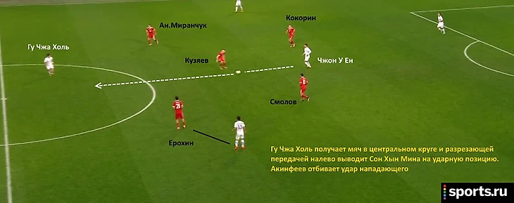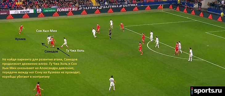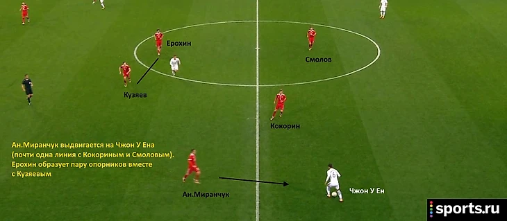 При позиционных атаках корейцев Кузяев чаще всего (но не всегда) располагался ниже партнеров. Антон Миранчук и Ерохин высоко выдвигались на центрального защитника или спускающегося к ним опорника, который владел мячом.