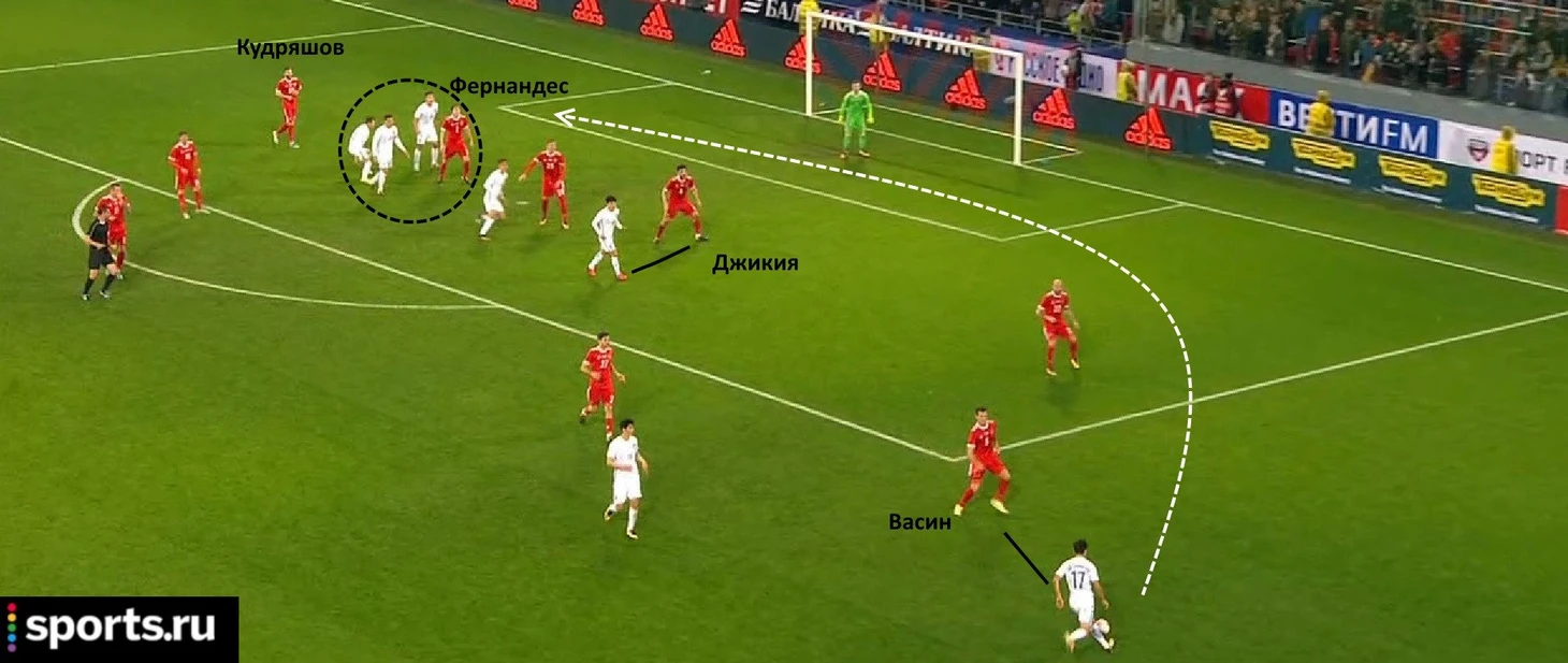 Кокорин и Смолов впервые за долгое время вышли в атаке одной команды. По движению получилось неплохо: когда один уходил в глубину, другой тут же заменял его на острие.