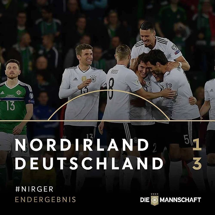 Лишь в конце встречи команды смогли подогреть немного зазевавшихся наблюдателей матча. Киммих слёту расстрелял ближний угол Макговерна после очередного неудачного выноса от обороны соперника, а те, на последней добавленной минуте в типичной для себя манере, (навес с углового, передача головой, гол головой) всё же отквитали у немцев один мяч. Автором гола стал изрядно постаравшийся и явно заслуживший забить гол Джош Мадженнис. Но на общий итог это никак не повлияло – 1:3, немцы едут на чемпионат мира в Россию, а поражение североирландцев не стало для них катастрофой.