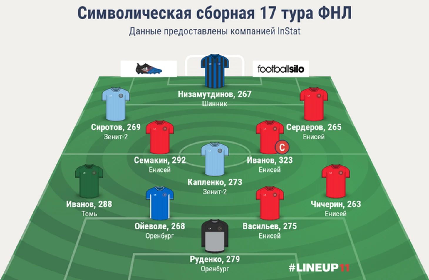 Лучшим клубом 17 тура ФНЛ стал "Енисей" со средним общекомандным рейтингом InStat Index, равным 247 баллам. Худшей же командой оказался "Тамбов", набравший лишь 179 баллов.