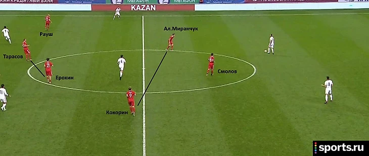 В развитии атак Дмитрий был привычно бесполезен. Когда мяч оказывался у центральных защитников, Тарасов часто располагался на одной линии с Миранчуком и Кокориным, а для розыгрыша мяча в глубину опускался Ерохин. Это сказалось и на цифрах: у Тарасова 31 передача вперед (77% точности), у Ерохина 42 (76%).