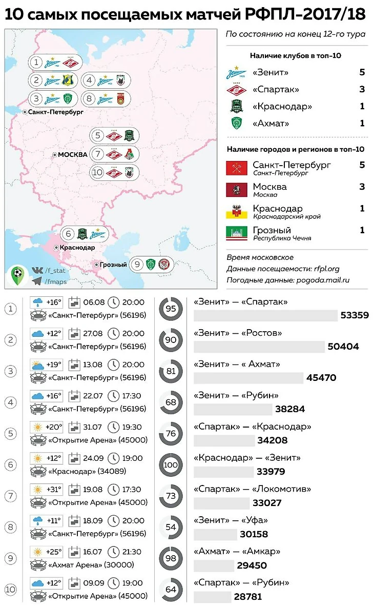 Теперь к лучшим показателям. С открытием новой арены «Зенит» вынес «Спартак» с первого места во всех хит-парадах живого зрительского интереса. Сразу четыре первые позиции у «сине-бело-голубых», а всего у Санкт-Петербурга целая половина рейтинга. Действующий чемпион страны, «Спартак», в одиночку представляет всю Москву и забирает 3 места в топе. Также по разу очень хорошо приходили на «Краснодар» и грозненский «Терек».