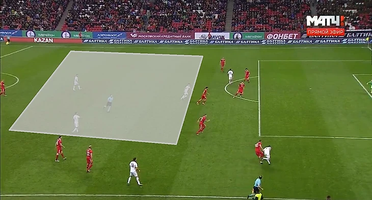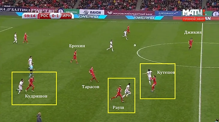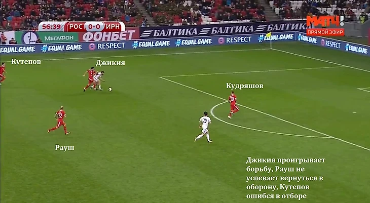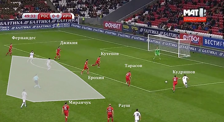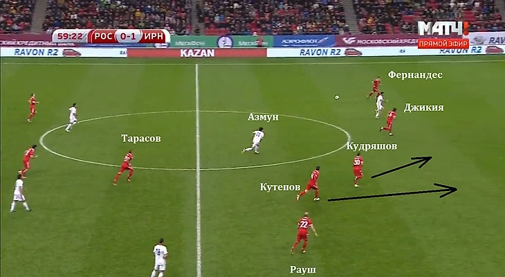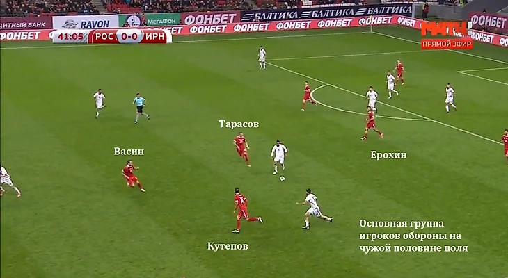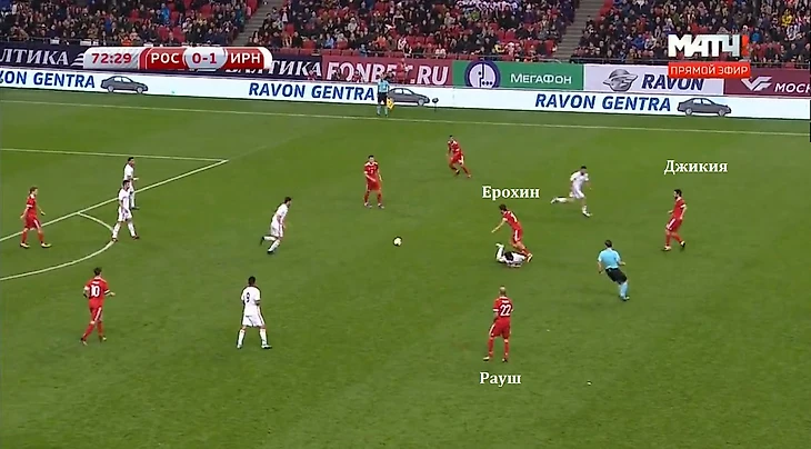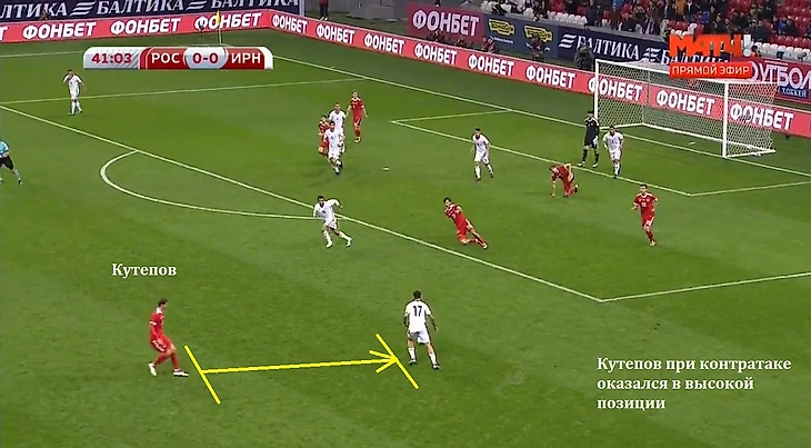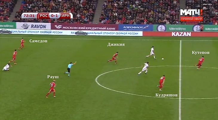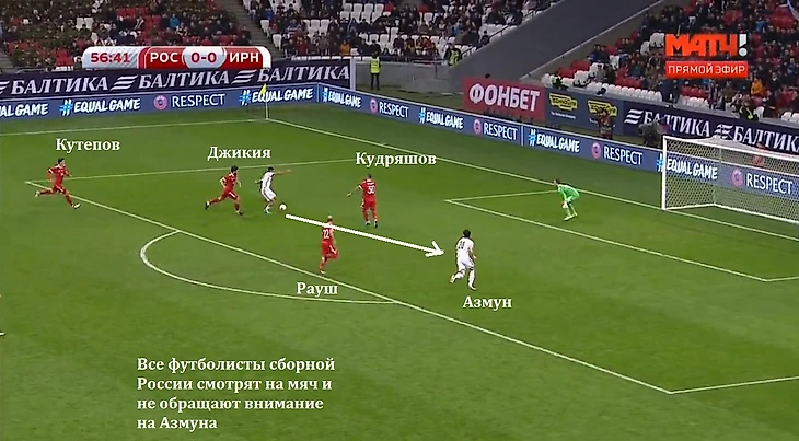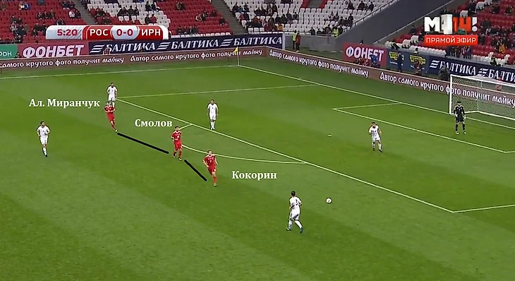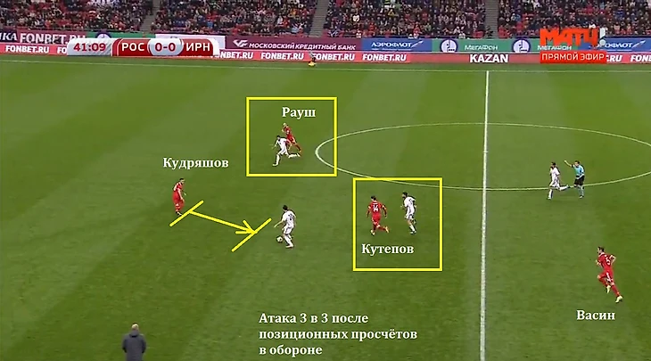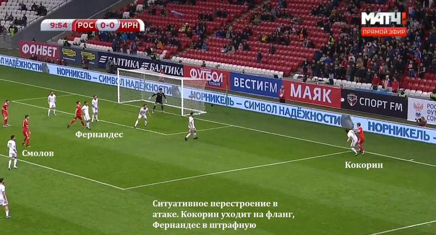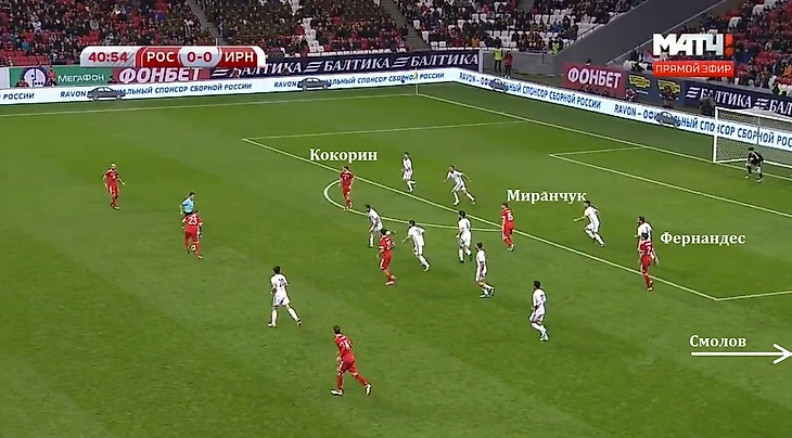 Здесь Кокорин намеренно уходит в центр для приёма мяча и освобождает таким образом пространство. Ерохин сместился из центра на фланг, чтобы закрыть зону партнёра. Кутепов благодаря этому получил возможность двигаться с мячом вперед и это не несёт угрозы. Почти все футболисты сборной Ирана за линией мяча, а позади Ильи ещё два центральных защитника.