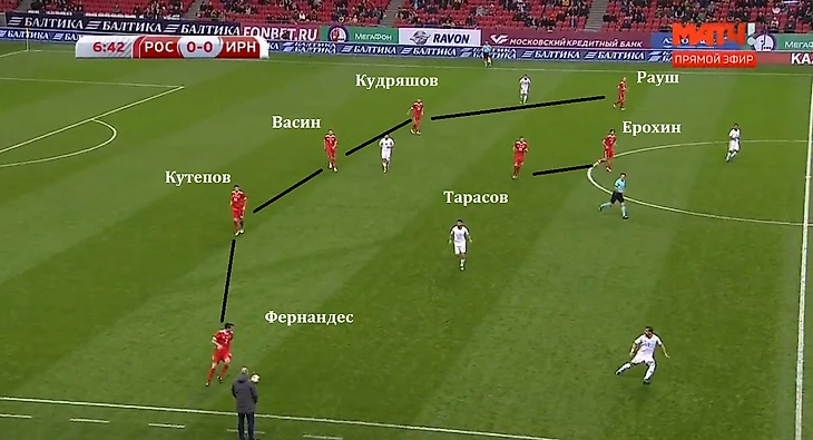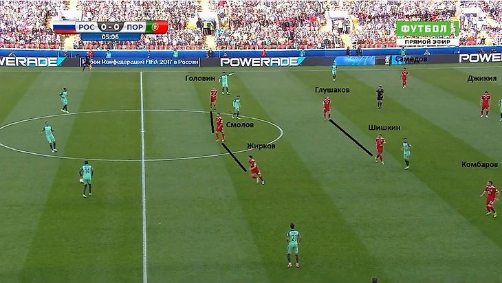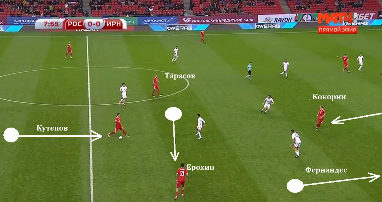 Во встрече со сборной Ирана подопечные Станислава Черчесова вышли на поле с расстановкой 5-2-3. Два опорных полузащитника – Ерохин и Тарасов, а Алексей Миранчук и Александр Кокорин заняли позиции инсайдов. Подобным образом команда сыграла в матче с Португалией.