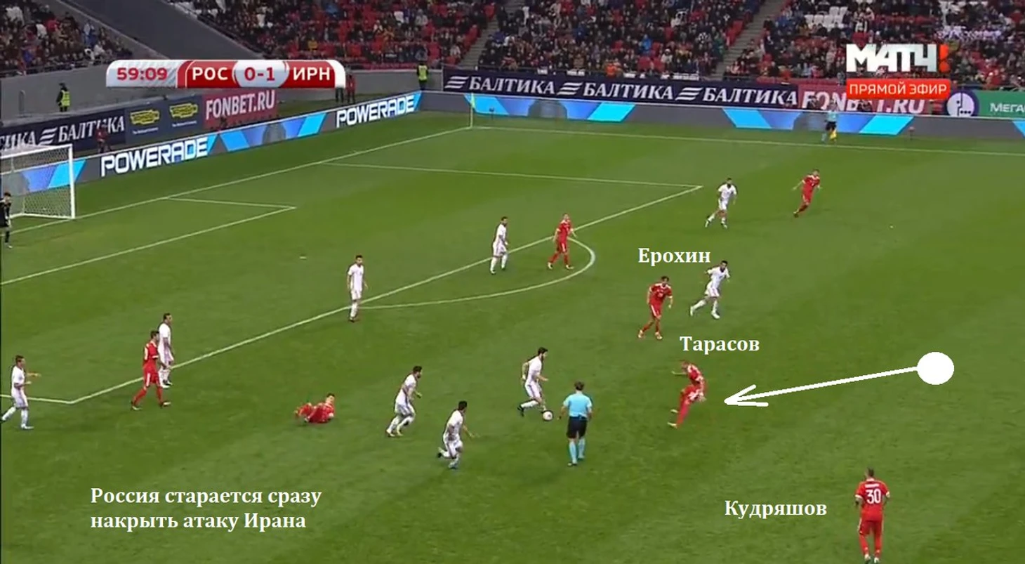 Футболисты получили установку как можно быстрее возвращать мяч после потери. Поэтому все старались как можно плотнее играть по зонам перед штрафной соперника. До концовки первого тайма это приносило свои плоды. Иран не был готов к такой модели и совершал потерю за потерей. Высоко играли центральные защитники, ближе к центру оказывались крайнее, а опорные полузащитники сходу бросались на игрока с мячом. Нападающие отрабатывали прессингуя из-за спины.