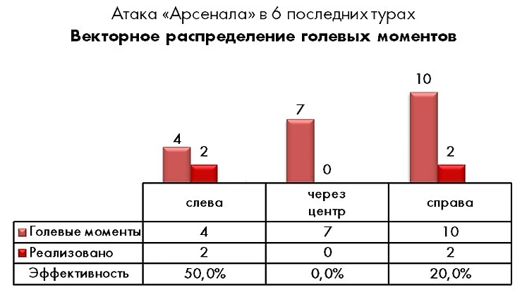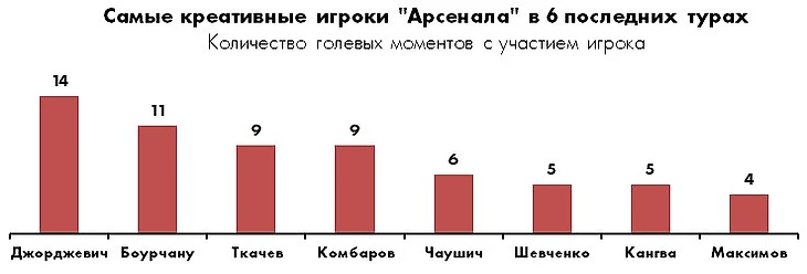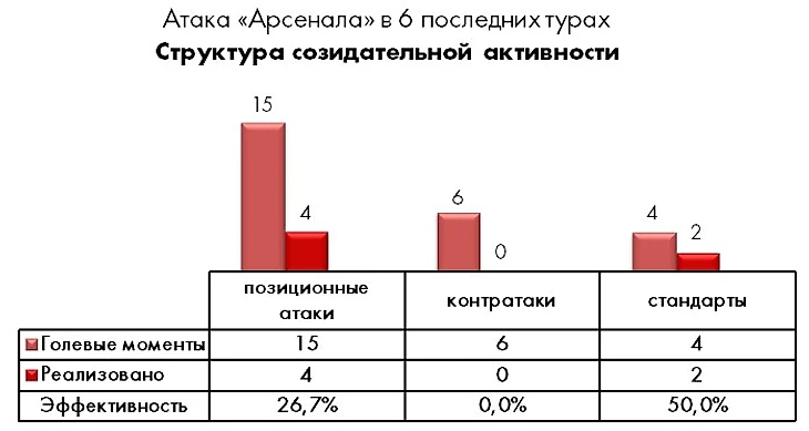 Структура голевого созидания «Арсенала» абсолютно нетипична для хрестоматийного андердога, поскольку львиную долю моментов команда создает в позиционном нападении. Важнейшую роль в начальной фазе развития атак выполняет румынский опорник Борчиану – на его счету 8 потенциально голевых стартапов в 6 последних турах (из них 5 – в «позиционке»).