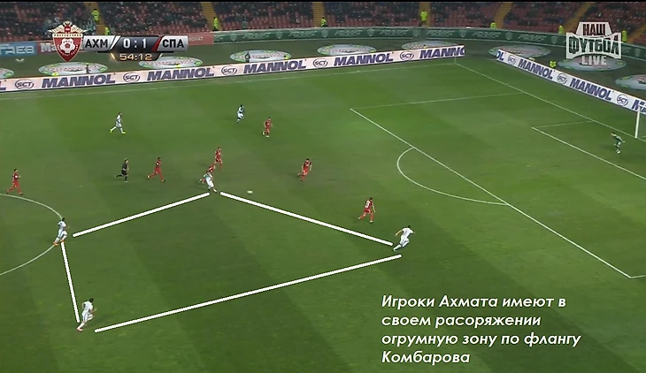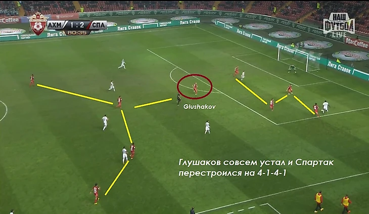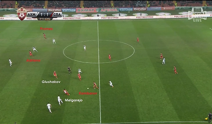 Кононов ответил оборонительной 5-3-2 (5-4-1) с опускавшимся в полузащиту Жаба. В первом тайме единственным вариантом атак "Ахмата" была попытка использовать забросы за спину защитникам "Спартака"(неточные передачи Глушакова не считаются).