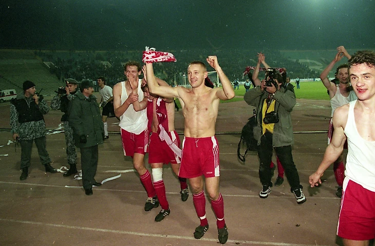1997 год. Андрей ТИХОНОВ празднует чемпионство "Спартака" с партнерами по команде.