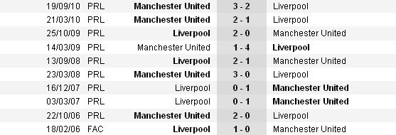 Во всех турнирах соперники провели 180 матчей. В 70 встречах победу праздновал «Манчестер Юнайтед», 60 матчей выиграл «Ливерпуль» и 50 игр завершились вничью.