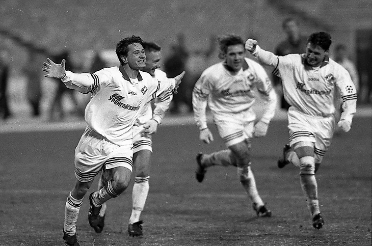 1995 год. Спартаковцы Дмитрий АЛЕНИЧЕВ, Андрей ТИХОНОВ, Сергей ЮРАН, Илья ЦЫМБАЛАРЬ: есть шесть побед в шести матчах Лиги чемпионов!