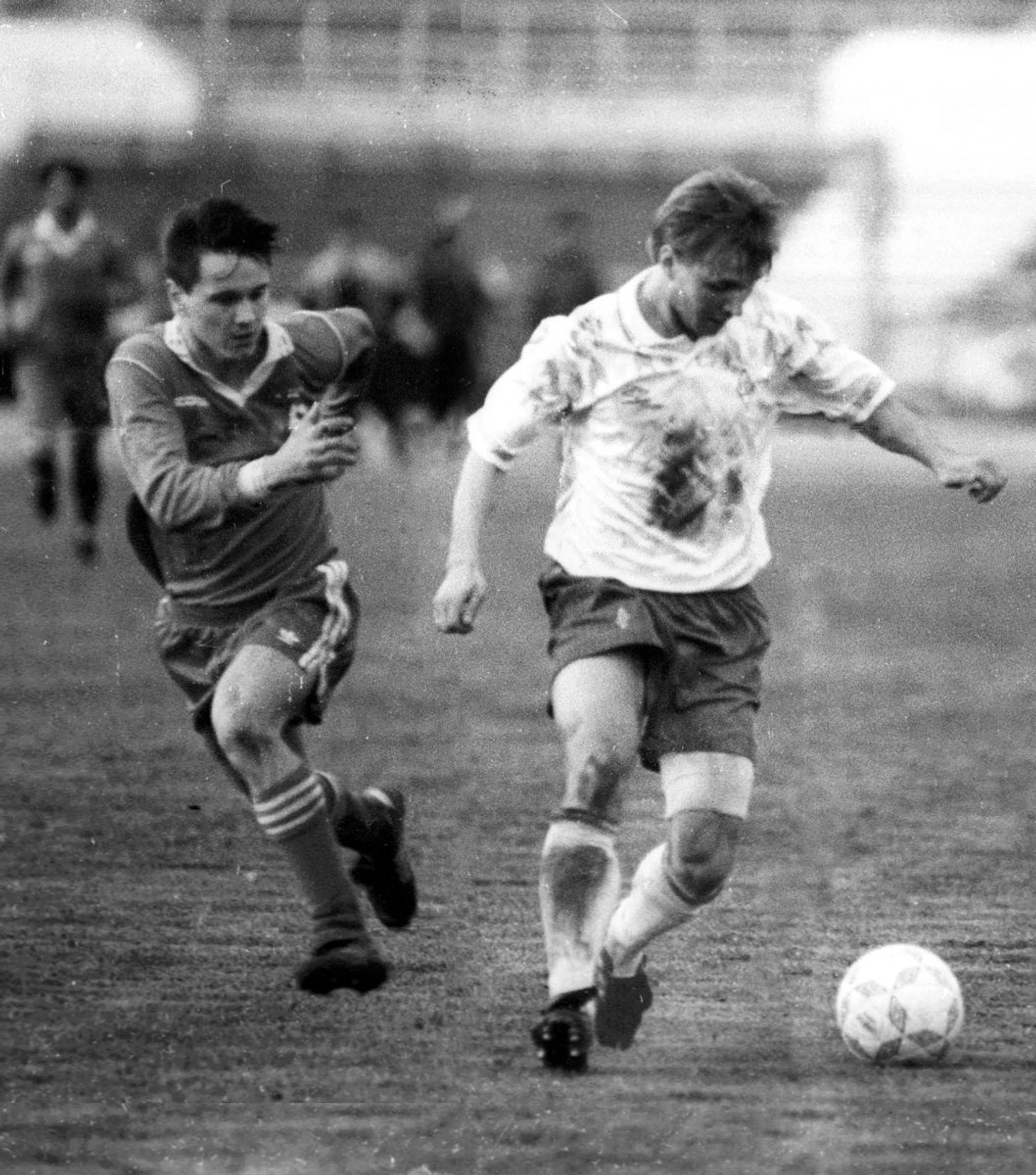 1992 год. Дмитрий АЛЕНИЧЕВ (слева) в матче "Локомотива" против динамовца Игоря КОЛЫВАНОВА.