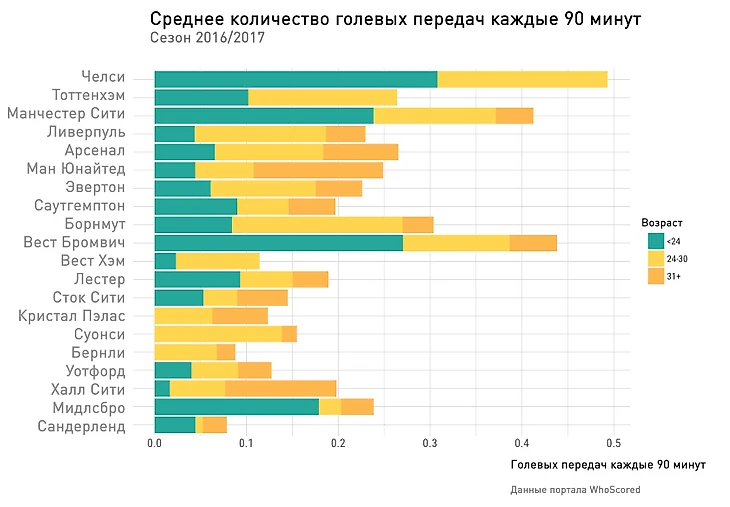 То же самое и в "Вест Бромвиче": например, Джонатан Леко имеет средний показатель 0,81 голевых передач каждые 90 минут, поскольку провел на поле 111 минут и сделал один голевой пас. Это неплохо для 18-летнего игрока, но вовсе не говорит о том, что в "Вест Бромвиче" очень талантливая молодежь.